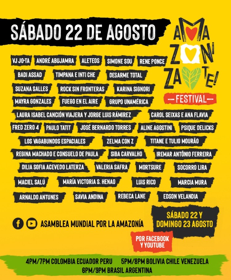 Es un encuentro de música, conciencia y lucha, que une diversas voces de todo el mundo en torno al grito de: ¡Basta de las quemas! ¡Basta del extractivismo depredador! ¡Basta del etnocidio y ecocidido en la Amazonía! Juntos, todos y todas, nos adherimos a la lucha por la Amazonía, por la vida y por un futuro.