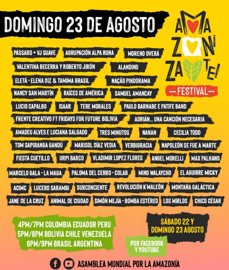 Es un encuentro de música, conciencia y lucha, que une diversas voces de todo el mundo en torno al grito de: ¡Basta de las quemas! ¡Basta del extractivismo depredador! ¡Basta del etnocidio y ecocidido en la Amazonía! Juntos, todos y todas, nos adherimos a la lucha por la Amazonía, por la vida y por un futuro.