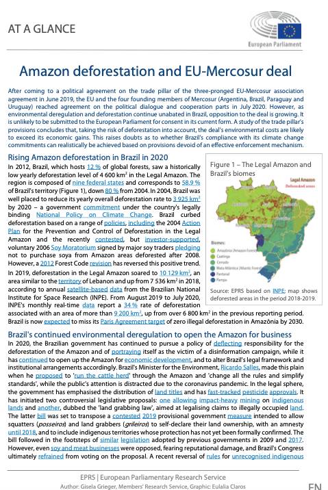 | In its October 2020 resolution on the implementation of the common commercial policy, the European Parliament emphasised ‘that the EU-Mercosur agreement cannot be ratified as it stands’. A September 2020 resolution on the EU’s role in protecting and restoring the world’s forests calls for an EU legal framework for due diligence to ensure sustainable and deforestation-free supply chains for products and commodities placed on the EU market. Following a debate on Amazon forest fires in September 2019, Parliament organised a debate on land grabbing and deforestation in the Amazon in June 2020, which called for support for stakeholders and initiatives in Brazil opposing deforestation |