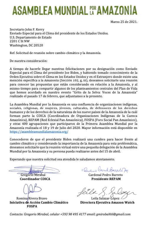 El pasado 25 de marzo, la Asamblea Mundial por la Amazonía (AMA) envió una carta dirigida al Secretario John F. Kerry, enviado especial para el clima del presidente de los Estados Unidos Joe Biden, para de solicitarle una reunión virtual con una delegación de la AMA. El fin de dicha reunión es conocer las propuestas que está considerando la administración de Biden en relación a la Amazonía, y al mismo tiempo exponerle los planteamientos centrales del «Plan de Vida«.