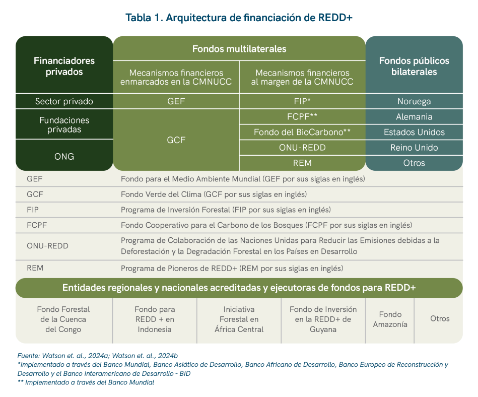 Existen varios canales a través de los cuales fluye la financiación para REDD+, siendo los principales: los fondos multilaterales (organizaciones y programas internacionales), los fondos públicos bilaterales (contribuidores nacionales) y los financiadores privados (empresas, Organizaciones No Gubernamentales y fundaciones privadas) (Tabla 1) (Watson et. al., 2024a; Watson et. al., 2024b).