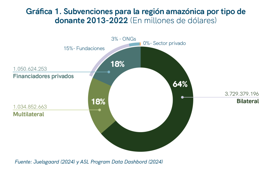 Los datos proporcionados por el Banco Mundial señalan que los gobiernos nacionales canalizaron el 37% de los 5.814 millones de dólares de fondos aprobados para la Amazonía entre 2013 y 2022, seguido luego por el sector privado o empresarial (24%), las grandes ONGs internacionales (17%) y luego las ONGs nacionales y locales (12%). Los gobiernos subnacionales, instituciones académicas y de investigación recibieron todos juntos el 4% de estos fondos; mientras que las organizaciones indígenas recibieron de forma directa apenas el 0,1%(Gráfica 3).