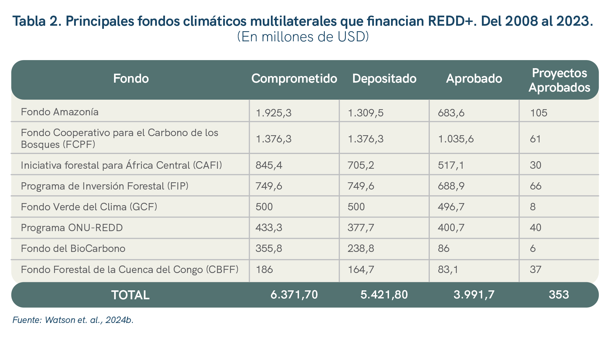 Estos fondos multilaterales provienen de distintas instituciones. Algunas de ellas, como el Fondo Verde del Clima, están enmarcadas dentro de la CMNUCC, mientras que otras están al margen de la CMNUCC y son gestionados y administrados por financieras multinacionales como el Banco Mundial, los Fondos de inversión en el Clima (CIF por sus siglas en inglés) o programas regionales y/o nacionales como el Programa de Pioneros de REDD+ (Tabla 1). Adicionalmente, existen entidades regionales y nacionales acreditadas y ejecutoras de fondos para REDD+, como ser: el Fondo Amazonía, la Iniciativa Forestal para África Central (CAFI por sus siglas en inglés), el Fondo de Inversión en la REDD+ de Guyana, el Fondo para REDD+ en Indonesia, entre otros (Tabla 1 y 2) (Watson et. al., 2024b).