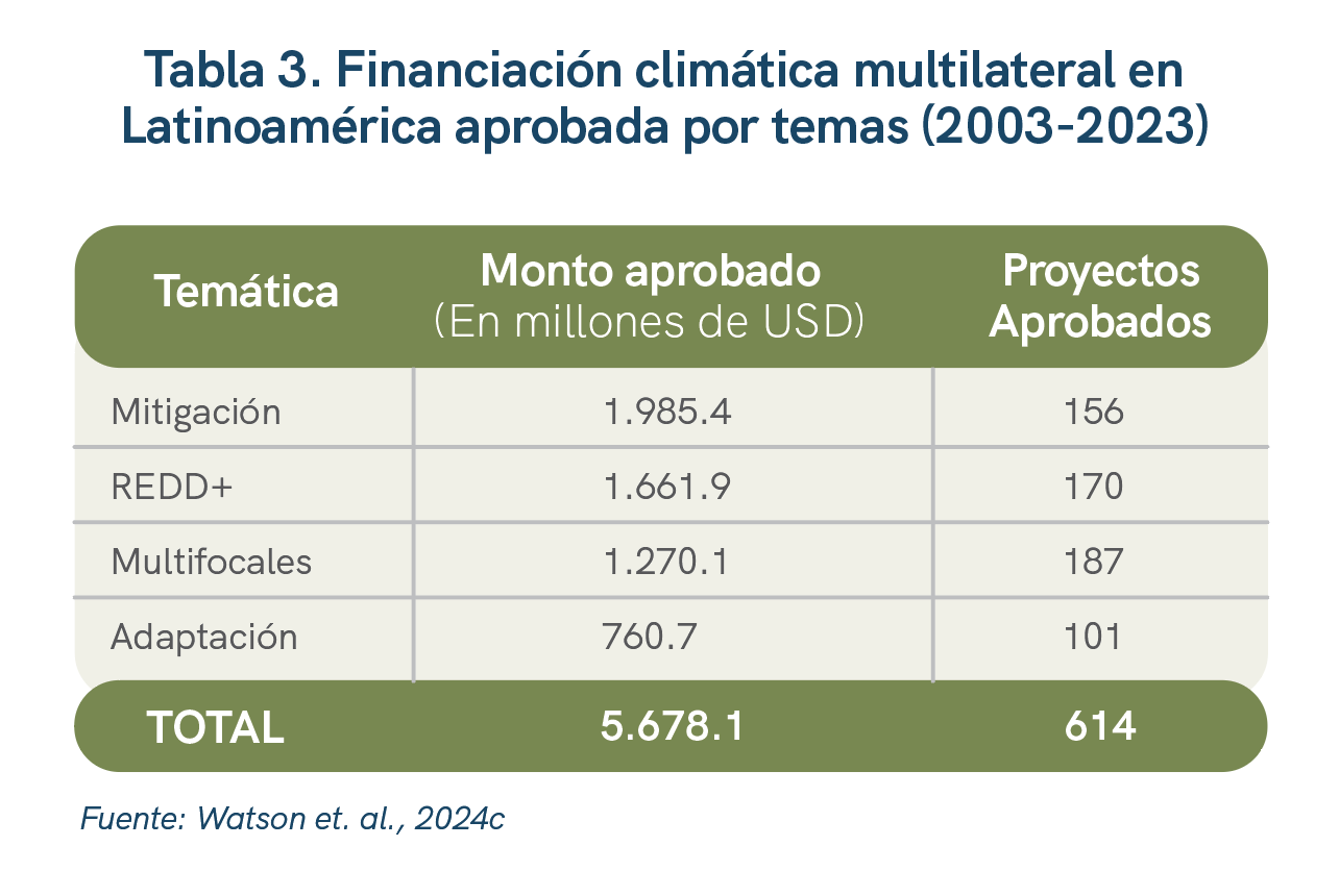 Los países latinoamericanos son uno de los principales receptores de esos fondos. Según Climate Funds Update, entre 2003 y 2023, se aprobaron 1.661 millones de dólares para proyectos REDD+ en Latinoamérica, equivalente al 29% del total de los fondos climáticos multilaterales destinados para la región (Watson et. al., 2024c). Esto hace de REDD+ la segunda categoría más financiada, solo superada por proyectos de mitigación al cambio climático que concentró 1.985 millones de dólares aprobados (donde a veces también se incluyen algunos proyectos REDD+). De hecho, el financiamiento destinado a REDD+ y a mitigación supera con creces el financiamiento multilateral aprobado para proyectos de adaptación al cambio climático y proyectos multifocales (Tabla 3).