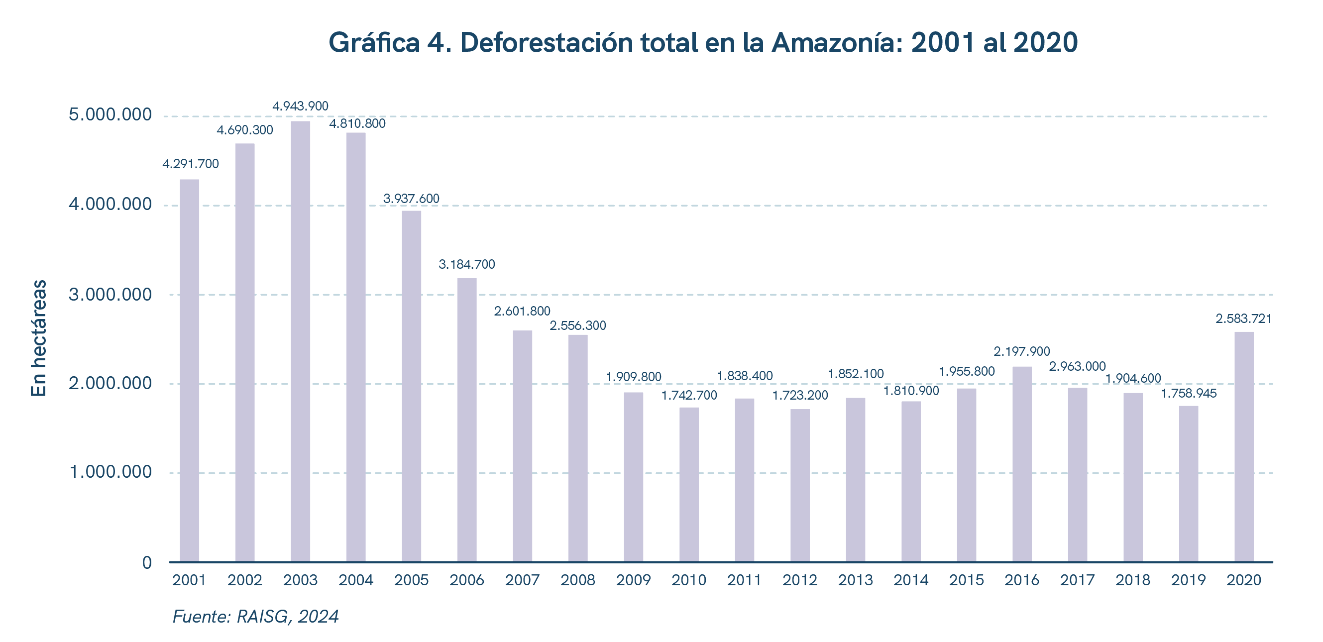 REDD+ no solo no beneficia a los pueblos indígenas y a las comunidades locales, sino que tampoco detiene el avance de la deforestación ni el cambio climático. De acuerdo con Global Forest Watch, desde 2002 a 2023 se perdieron más de 76 millones de hectáreas de bosques primarios tropicales a nivel mundial, lo que representa una disminución del 7% del área total de estos bosques (Weisse et. al., 2024). Los datos de la Red Amazónica de Información Socioambiental Georreferenciada (RAISG) reportan que entre 2001 y 2020 la Amazonía perdió 54 millones de hectáreas, equivalente al 9% de su cobertura forestal, con una pérdida promedio anual de 2.7 millones de hectáreas (Gráfica 4). La mayor deforestación en este periodo ocurrió en la Amazonía brasileña, seguida por Bolivia, Perú, Colombia y Ecuador.