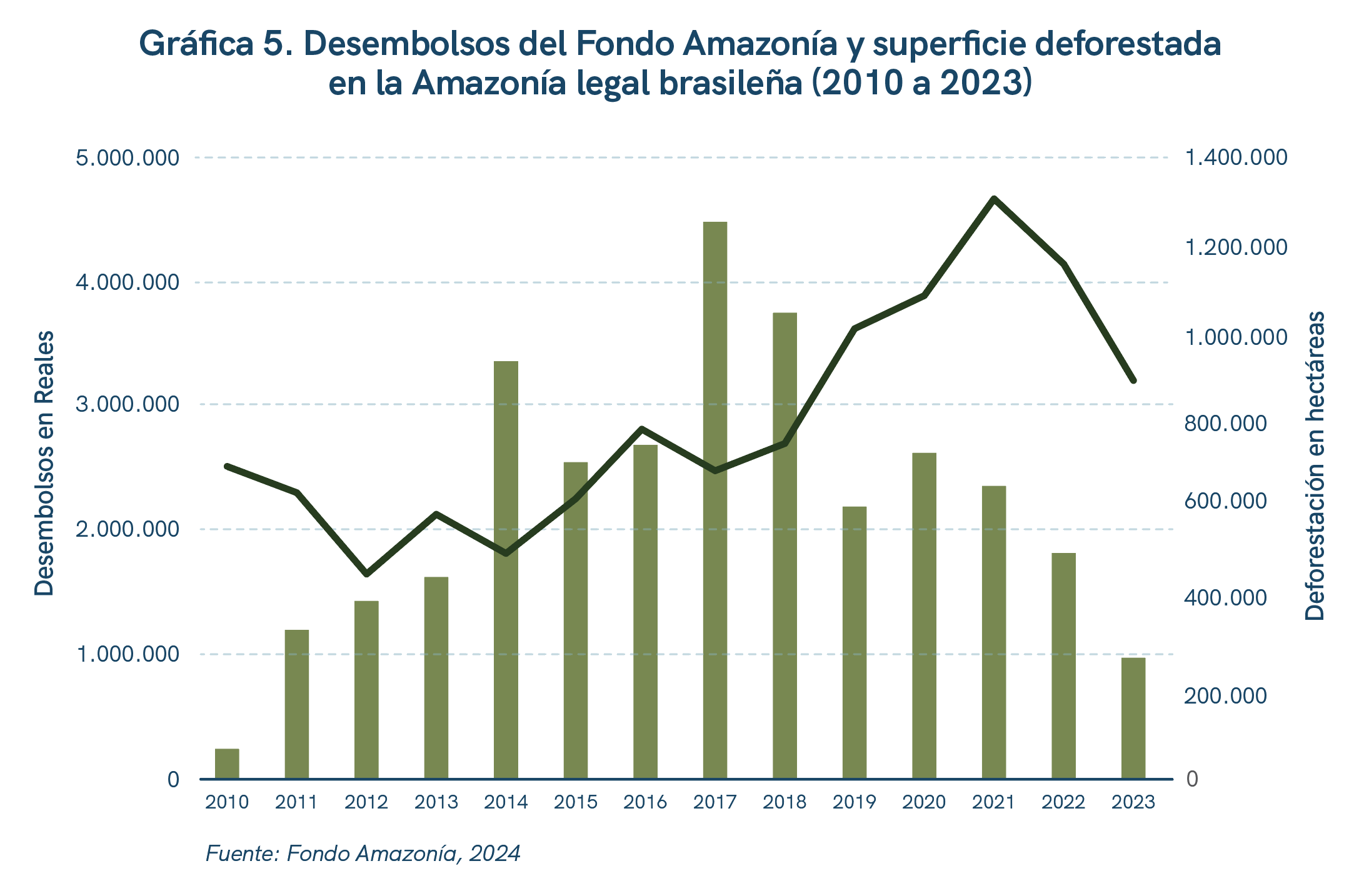 La Amazonía brasileña ejemplifica cómo, a pesar de los fondos canalizados para programas REDD+, los índices de deforestación continuaron aumentando. Entre 2010 y 2023, el Fondo Amazonía (el principal fondo regional para programas REDD+ y con mayor cantidad de fondos comprometidos), depositó 1.5 mil millones de Reales (equivalente a unos 285 millones de dólares) para proyectos REDD+ en toda la Amazonía legal brasileña[13]. Sin embargo, la deforestación siguió un crecimiento constante, acumulando más de 11 millones de hectáreas deforestadas en ese mismo periodo. Deforestación que fue agravada durante el gobierno de Bolsonaro entre 2019 y 2022, debido al desmantelamiento de las entidades ambientales nacionales (Fondo Amazonía, 2024; WRM, 2020) (Gráfica 5).