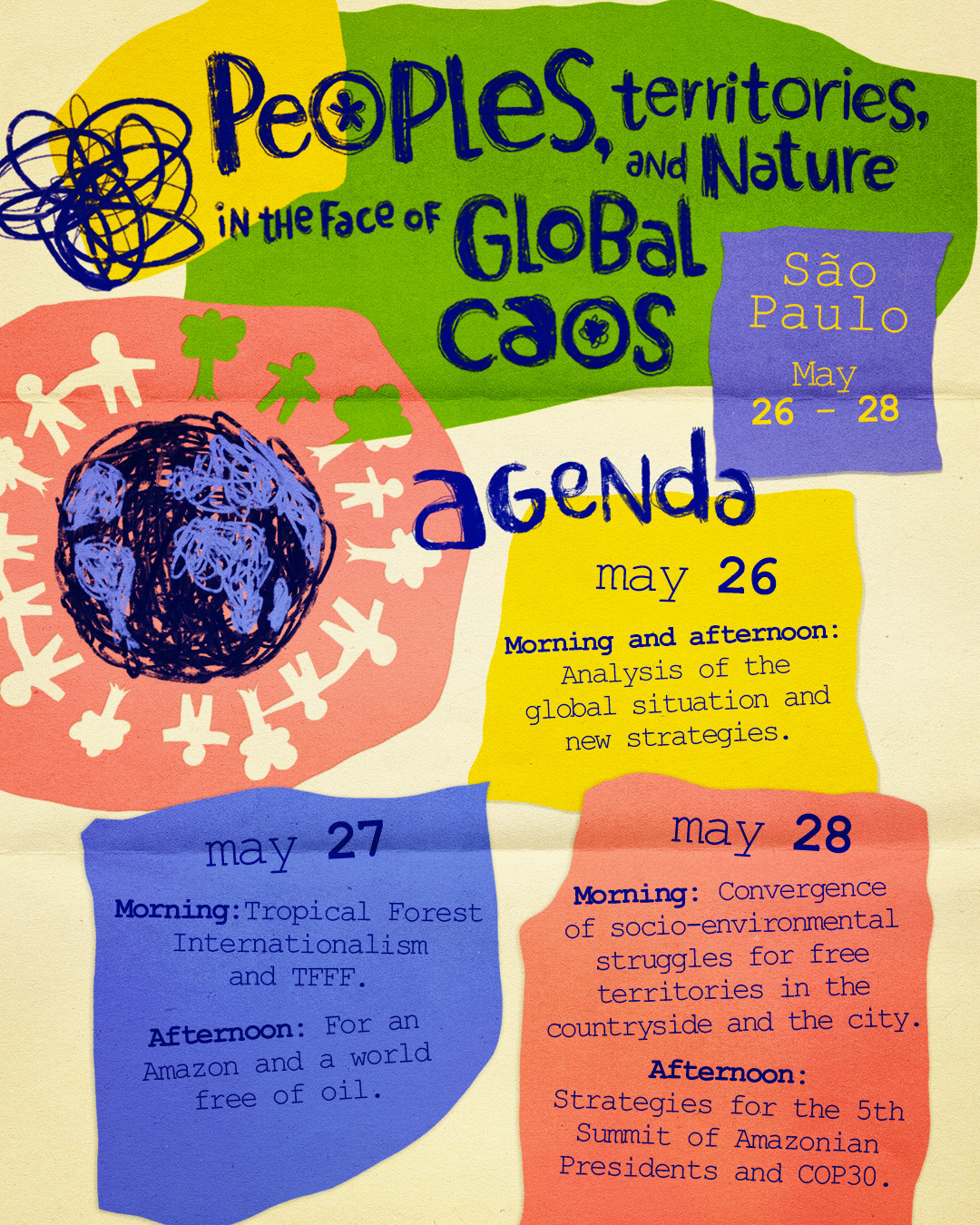 To reflect on the new global situation and connect our struggles, the People’s Mobilization for the Earth and the Climate and the undersigned organizations will organize the international meeting «Peoples, Territories, and Nature in the Face of Global Chaos» from May 26 to 28 in São Paulo, Brazil, to discuss the current agenda that is being built: